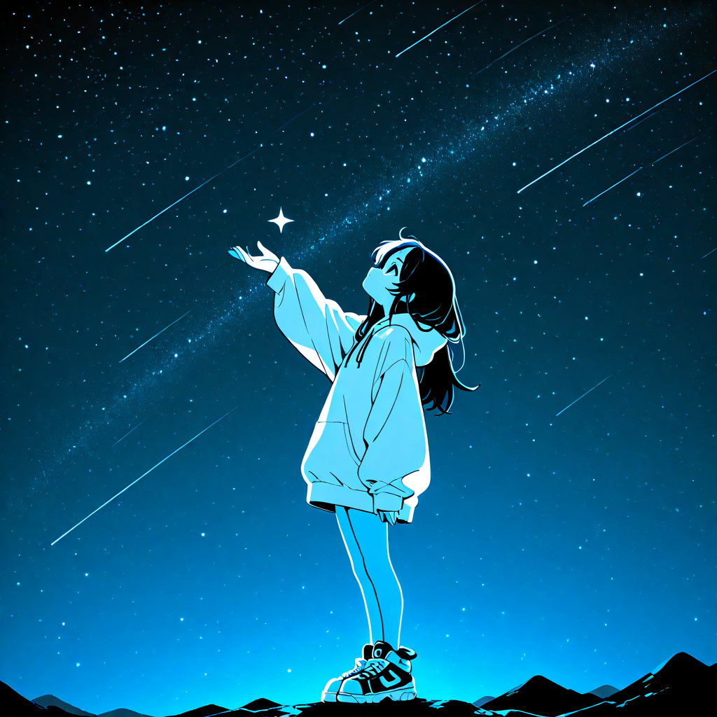 girl, standing, starry twilight sky, looking up, reaching toward the sky wearing over oversized white hoodie, oversized sneakers, bare legs black long hair, profile view, monochrome, simple background, flat color,