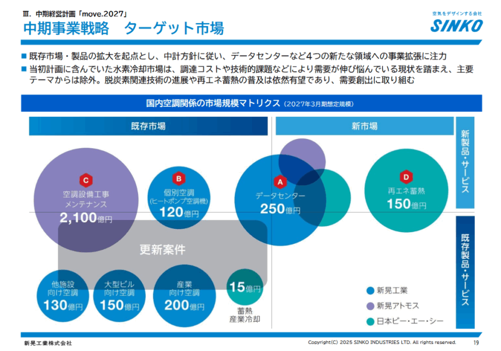 事業内容は業務用空調機器の製造・販売を中核に、関連する工事・保守やビル管理