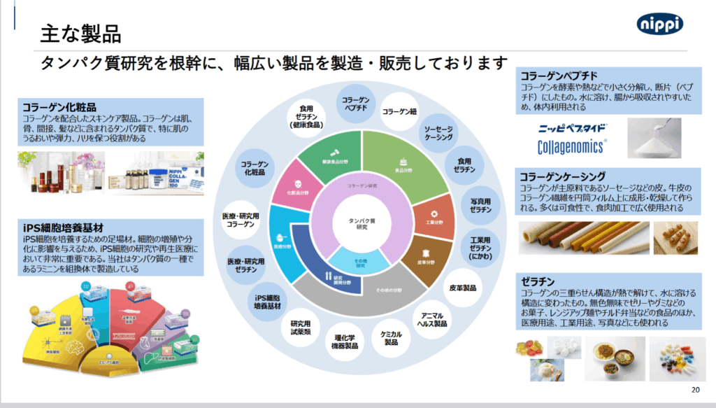 コラーゲン、ゼラチン、化粧品、iPS細胞などがキーワードの会社。